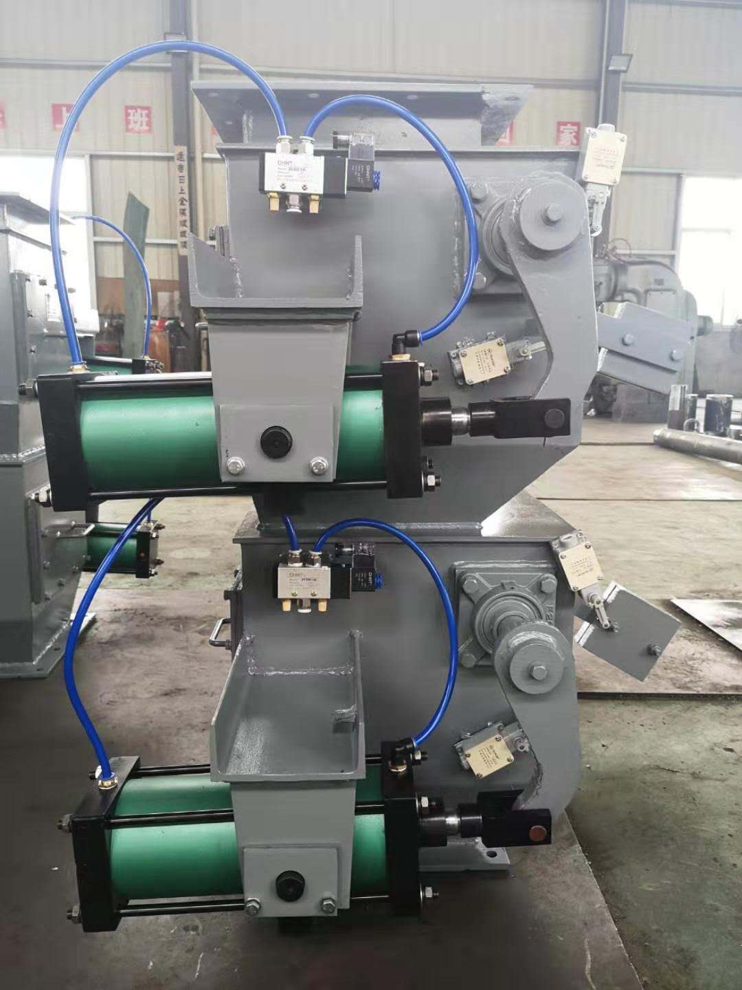 新型復(fù)式智能電動(dòng)雙層卸灰閥上、下閥采用獨(dú)立驅(qū)動(dòng)裝置,分別控制上、下卸灰閥打開(kāi)或關(guān)閉。密封部位采用軟性密封件,且密封件通徑大于卸灰閥閥口通徑,卸料過(guò)程對(duì)密封件無(wú)沖刷,保證了密封件使用壽命。本卸灰閥工作時(shí),系統(tǒng)程序與皮帶聯(lián)動(dòng),初始狀態(tài)為上閥常開(kāi),下閥關(guān)閉,將大煙道中的物料通過(guò)料倉(cāng)儲(chǔ)存在卸灰閥中部?jī)?chǔ)料倉(cāng)中。按PLC程序依次定時(shí)、定量排料,關(guān)閉上卸灰閥后打開(kāi)下卸灰閥,將中部?jī)?chǔ)料倉(cāng)的物料卸出,卸料完成關(guān)閉下閥后再打開(kāi)上閥,進(jìn)入下個(gè)循環(huán)程序。如遇大量落料,物料在卸灰閥中部?jī)?chǔ)料倉(cāng)堆積高度到達(dá)阻旋料位計(jì)時(shí),PLC接收到信號(hào)后將進(jìn)入排料程序,排料后系統(tǒng)自動(dòng)恢復(fù)至定時(shí)排料程序。由于在此過(guò)程中,始終有一個(gè)閥處于關(guān)閉狀態(tài),因此保證了系統(tǒng)的氣密性,負(fù)壓波動(dòng)小,生產(chǎn)穩(wěn)定,煙道下料倉(cāng)只是落料通道物料落入卸灰閥中部料倉(cāng)內(nèi),卸灰閥完成排料工作,徹底解決了堵倉(cāng)現(xiàn)象。從而保證了卸灰系統(tǒng)在不漏風(fēng)的狀態(tài)下正常運(yùn)行。